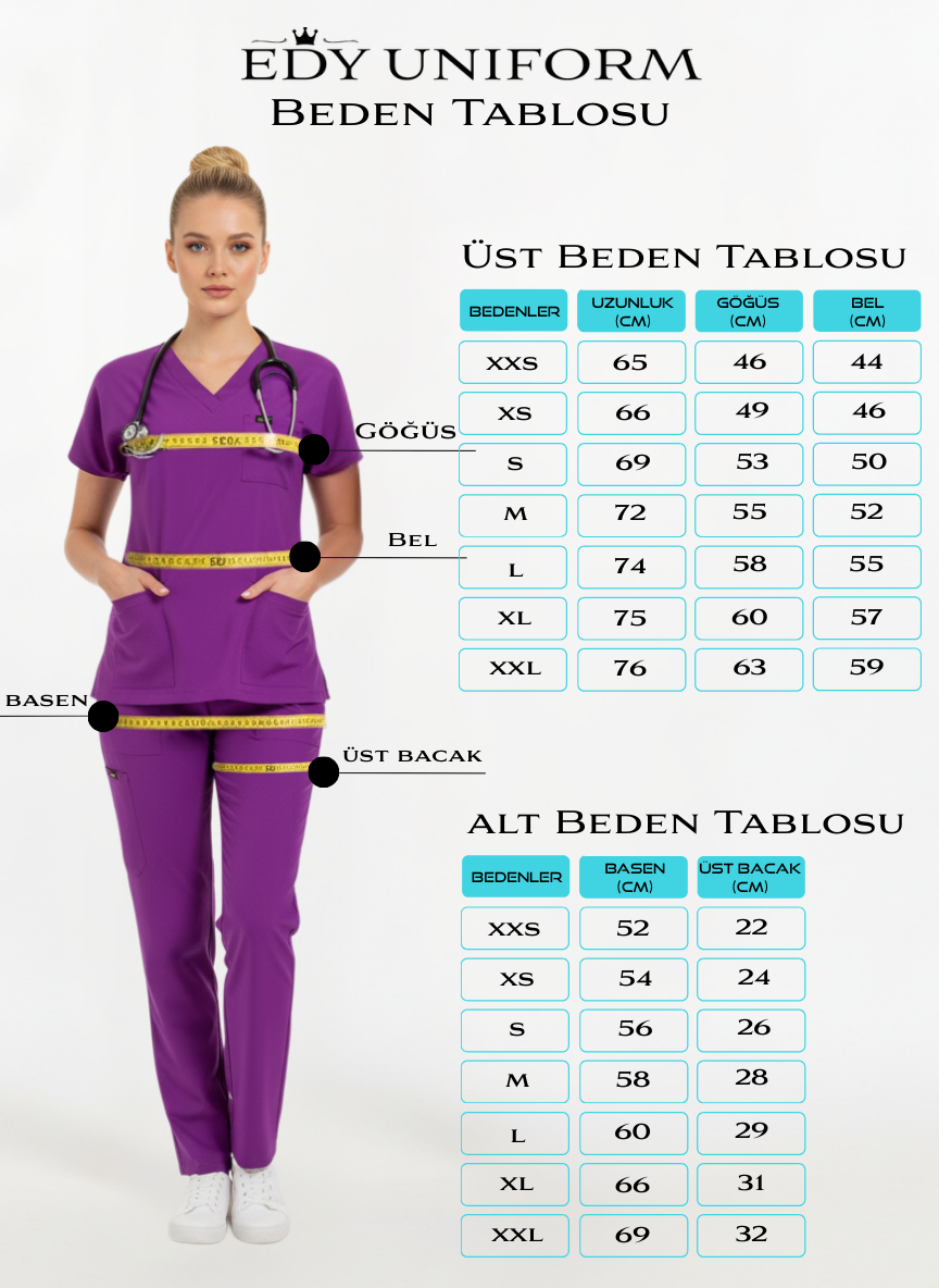 Yağ yeşilinin doğal sakinliği ile siyahın net ve güçlü duruşunu bir araya getiren EDY YAĞ YEŞİLİ Üst SİYAH Alt Kombin, yoğun tempolu sağlık ortamlarında profesyonel görünümden ödün vermeden konfor ve stil arayanlar için ideal bir tercihtir.